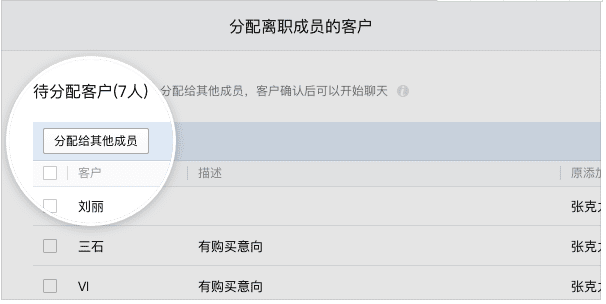如果在后台,依次点击「客户联系」-「离职继承」就能进行分配;如果在手机端,依次点击「工作台」-「客户联系」-「分配」-「分配离职员工客户」,就可以了。如果客户在24小时内没有主动点击「暂不添加」,那么新员工就能成功对接离职员工客户。