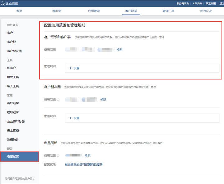 第一步,管理员登陆企业微信后台,依次点击「客户联系」-「权限配置」-「配置使用范围和管理规则」,设置好使用范围,就可以了 。