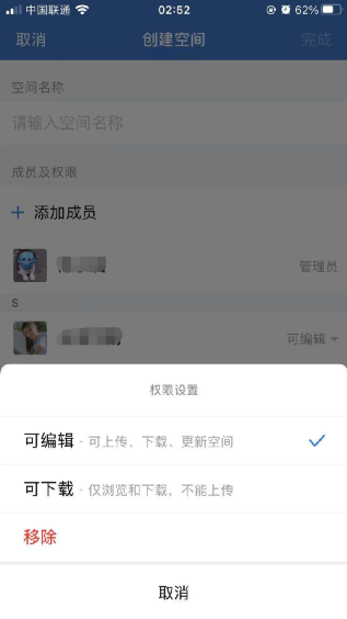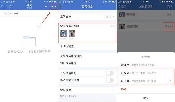 同一个共享空间内的人员,除空间管理员外,空间成员有可编辑、可下载两种权限。打开【微盘】-【共享空间】-【设置】-【空间成员及权限】,点击即可设置微盘文件权限。