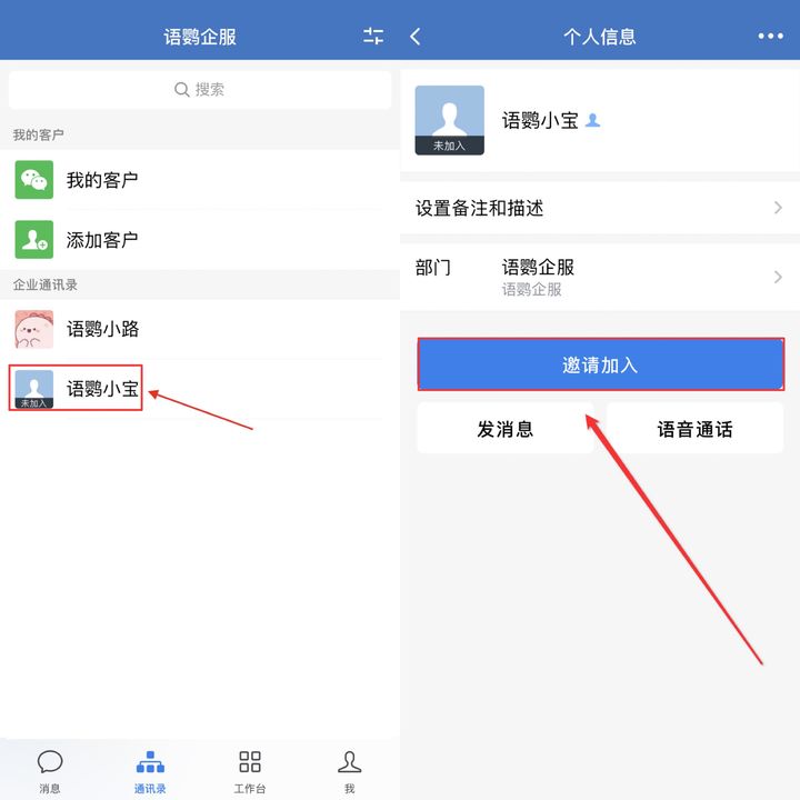 这时候,我们可以登陆企业微信,在通讯录页面中点击该成员的头像,在个人信息页面选择「邀请加入」即可催促该成员尽快加入企业微信。