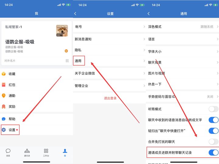 打开企业微信,在「我」页面点击「设置」–「通用」,打开「邀请成员进群并附带聊天记录」开关。