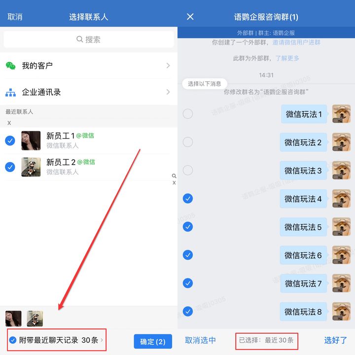 2)若群聊的聊天记录大于30条时,则会默认勾选最近的30条聊天记录。若需要分享大于30条记录,可以手动进行选择,手动选择记录的上限一次最多500条。另外,企业微信的聊天记录目前暂不支持语音和红包等消息同步。