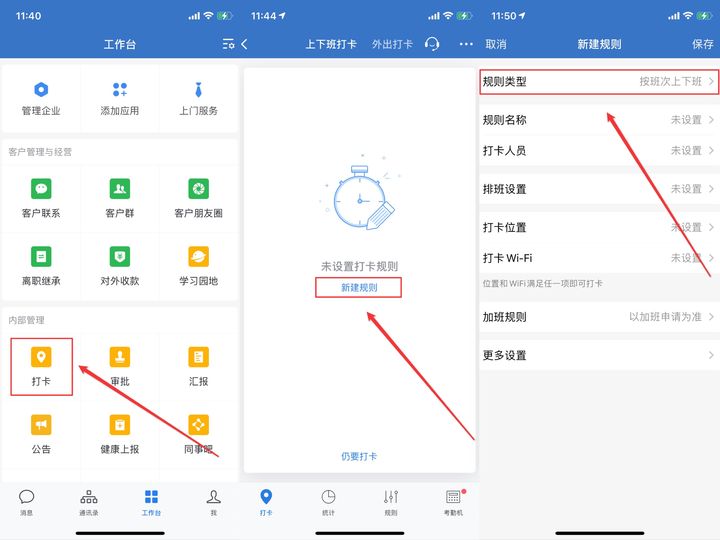 第一步:打开企业微信,在「工作台」页面点击「打卡」-「新建规则」,在新建规则页面的规则类型选择按班次上下班。