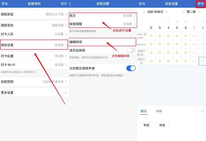 第二步:在新建规则页面点击「排班设置」,进行班次和排班周期的设置后,点击「编辑排班」,在企业微信上完成人员排班设置操作后点击「保存」即可。