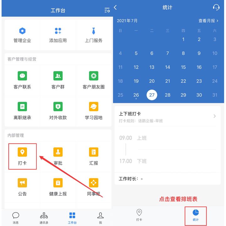 打开企业微信,在「工作台」页面点击「打卡」,点击右下方的「统计」页面即可查看到自己的排班表。