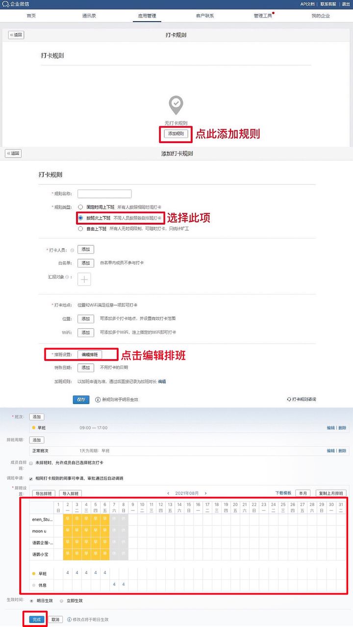 管理员登陆企业微信管理后台,在应用管理页面点击「打卡」,进入应用详情页面,在上下班打卡点击「查看」,也可查看排班表。