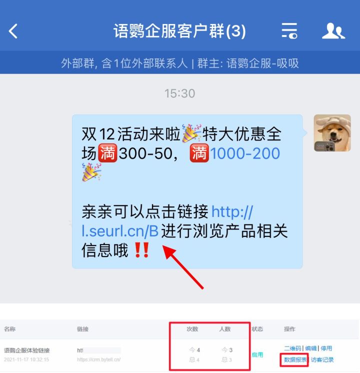 目前,在企业微信里企业是暂时无法查看社群链接点击量数据的,但是通过语鹦企服「社群链接跟踪」功能就可以查看。