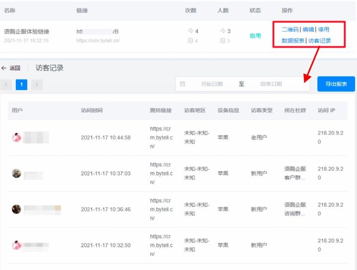 企业可以在语鹦企服私域管家管理后台的「社群链接跟踪」功能里查找到该链接,点击「访客记录」即可查看相关数据,同时支持导出相关数据报表。
