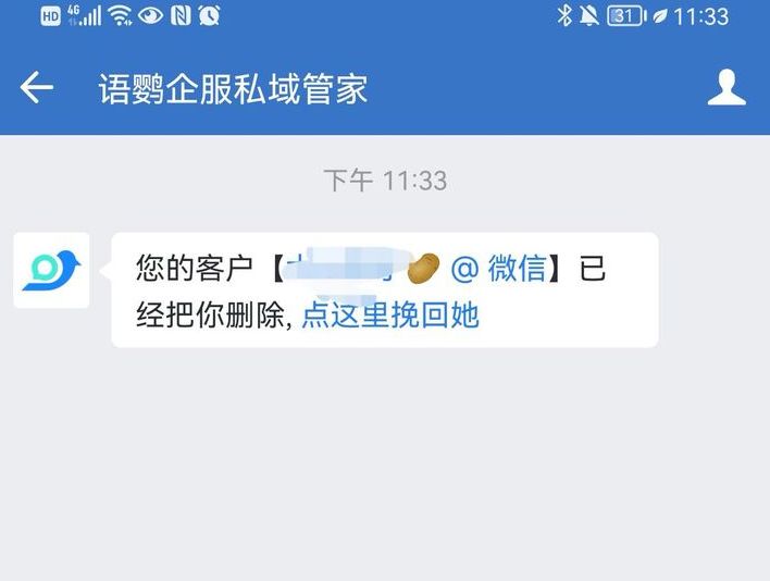 那么企业如何识别已经流失的客户并进行清理呢?使用语鹦企服的「被删提醒」功能,即可做到实时监测客户流失情况,让我们实时发现自己被哪些联系人删除了好友,便可以及时作出删除处理。当客户把员工删除的一瞬间,员工手机端就会收到如下类似的被删提醒。