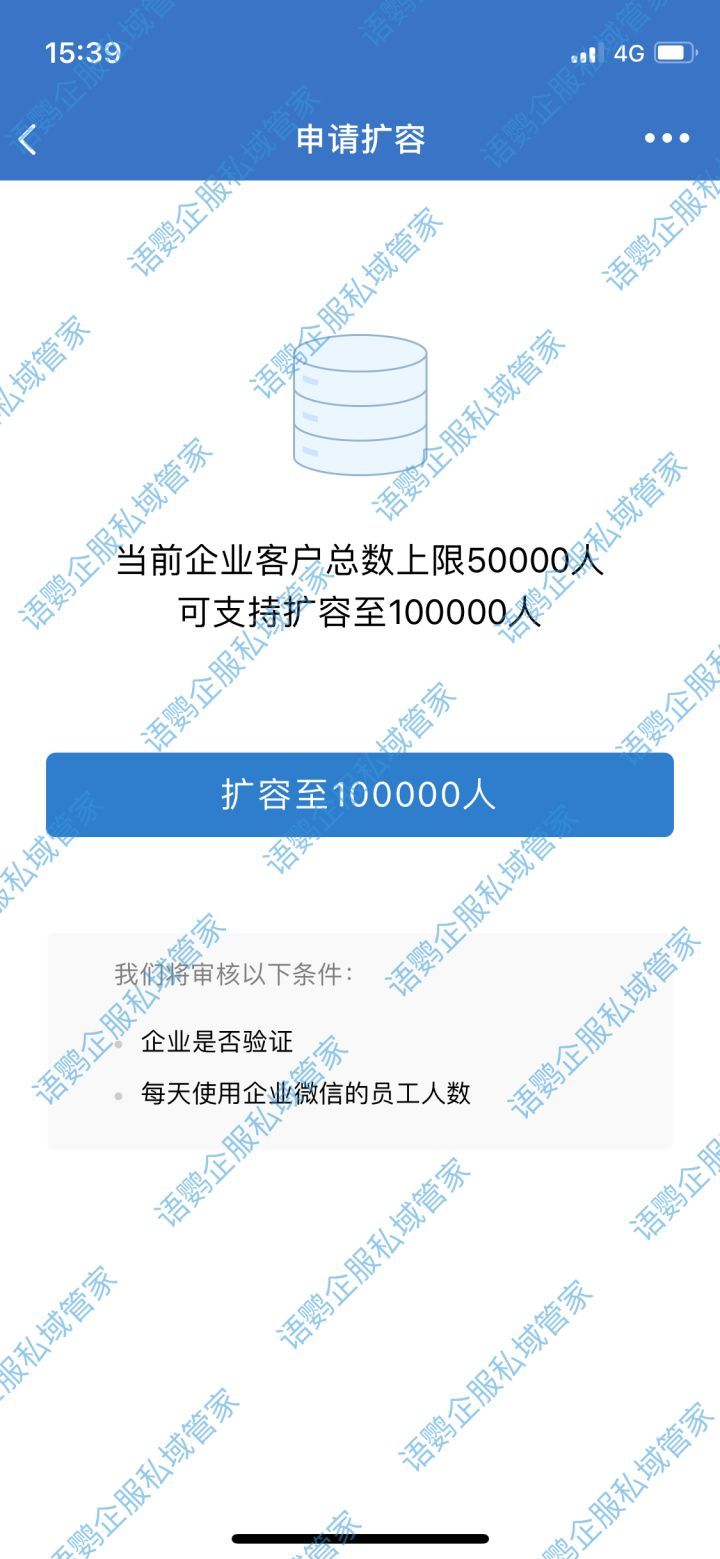 而且对于己认证的企业,每个企业的初始客户总上限是五万,每次可扩容50000人,总量没有限制,扩容次数也没有上限。