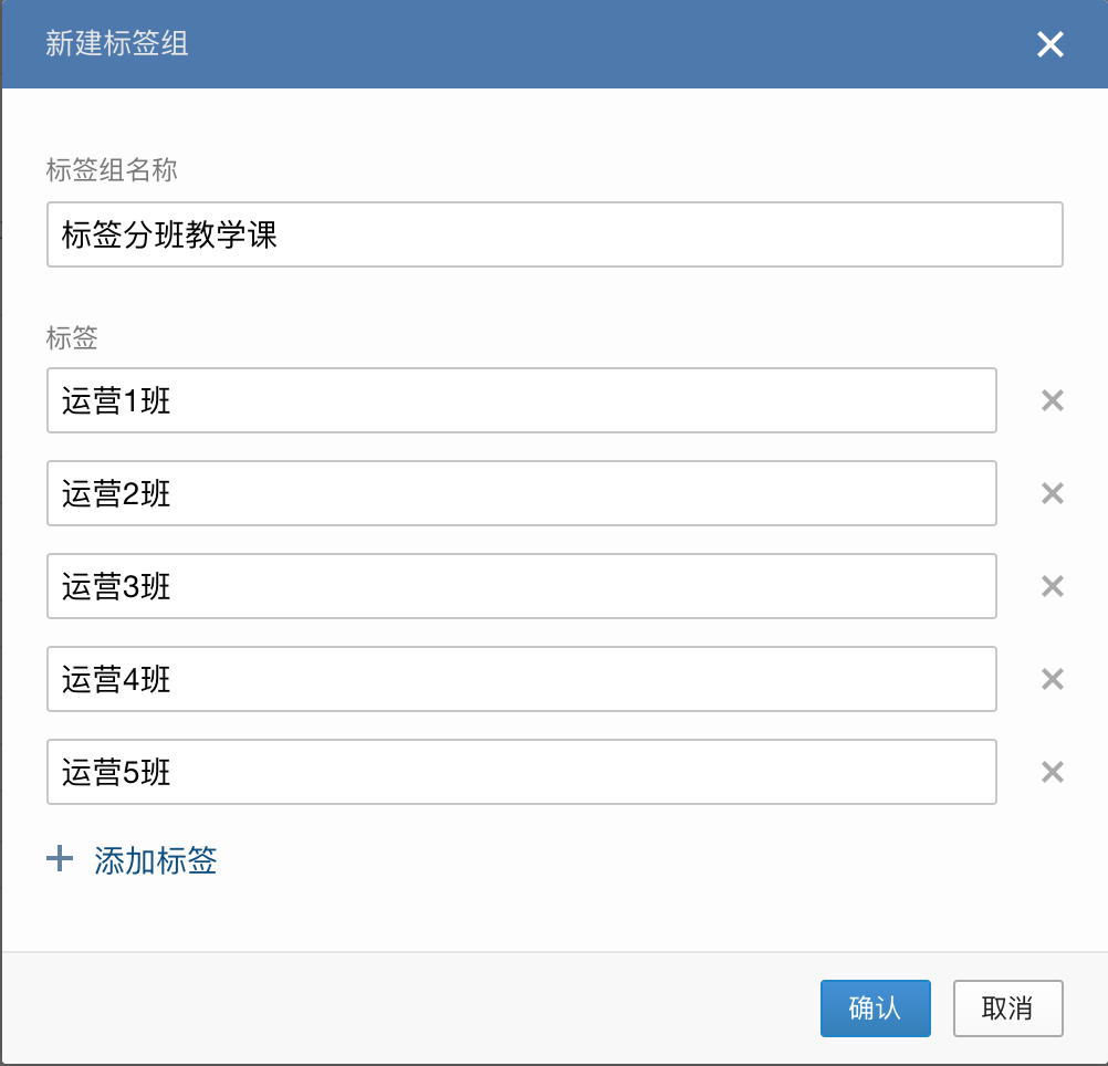 标签我们可以按预估的用户参与量配置需要分的班级,可以配置成下图那样。如果用户数太多,也可以随时增量的添加班级。