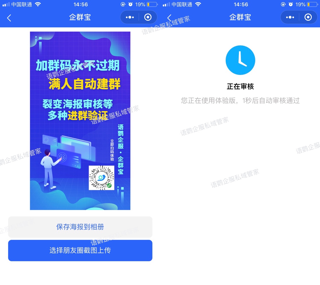 把想要裂变的海报保存到企群宝,用户只有通过分享海报并上传朋友圈宣传截图,审核通过才能进群,目前支持人工审核进群。