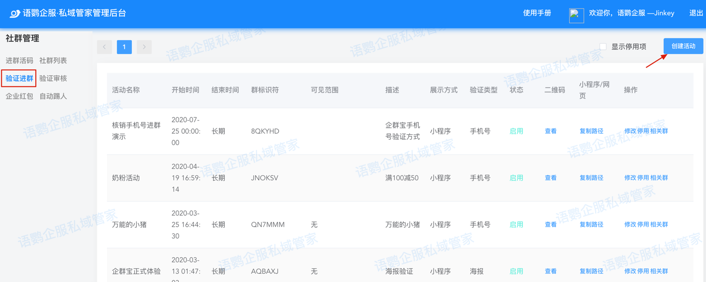 登录语鹦企服私域管家管理后台(http://admin.wecrm.net/),在【社群管理-验证进群】模块创建活动配置。