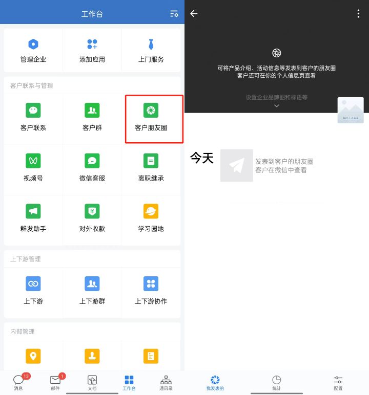 企业微信中的朋友圈,全称为“客户朋友圈”,企业可以通过管理后台统一推送,也可以开放员工使用客户朋友圈的权限,由员工自行发布。进入企业微信App,点击【工作台-客户朋友圈】即可发表。