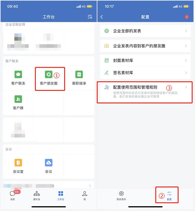 在手机端则需要点击【工作台-客户朋友圈-配置-配置使用范围和管理规则】进行配置。