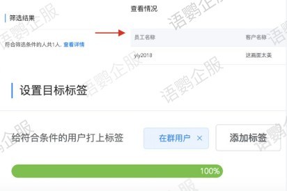 我们在语鹦企服工具箱中创建好标签任务,并且完成分析后,就可以查看筛选结果详情,为符合条件的群好友进行打标签操作。这样就可以为入群的好友自动打上标签啦,方便企业后续进行差异化管理。