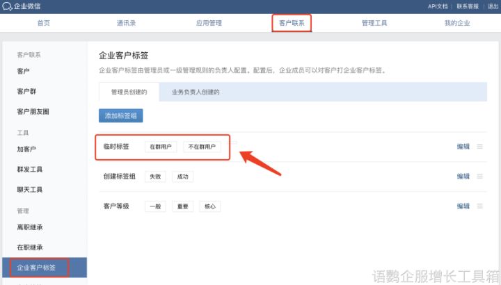 首先,先通过管理后台(【客户联系-企业客户标签】)或手机端(【工作台-客户联系-客户标签-新建标签组】)创建要打上的标签。