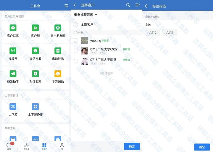 因此设置完标签之后,员工应该如何根据不同的标签来群发不同的信息呢?企业微信怎么按标签群发信息呢?其实也很简单,员工只要进入企业微信的工作台,点击【群发助手】,点击【选择客户】,并且按标签筛选,选择想要群发的标签就可以按标签群发信息啦!