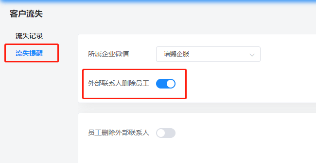 在左侧工具栏中,点击【流失提醒】,再点击【外部联系人删除员工】,即可开启提醒。
