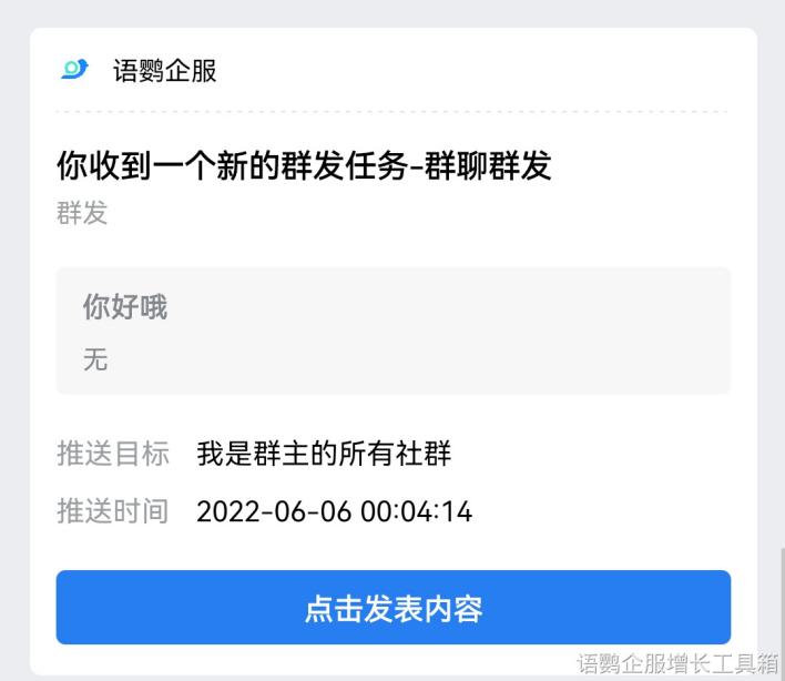 组建好社群后,需要提前规划好一周或一个月要发布的内容和活动,使用语鹦企服【定时群发SOP】功能,提前设置好发布内容,定时提醒员工一键发送。