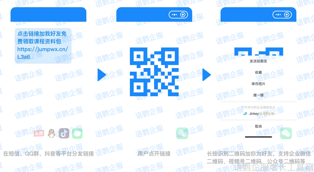 告别无效推广的关键在于缩短转化路径。传统引流需要用户先关注公众号、再点击菜单、然后跳转页面,每多一步就流失一批潜在客户。语鹦企服「加粉链接」支持将企业微信名片转换成链接直接投放,用户点击后一键添加,省去所有中间环节,特别适合短视频平台的投放场景。