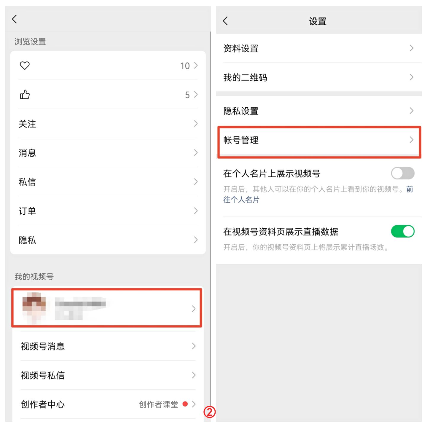 ②进入后点击我的视频号–设置–帐号管理。