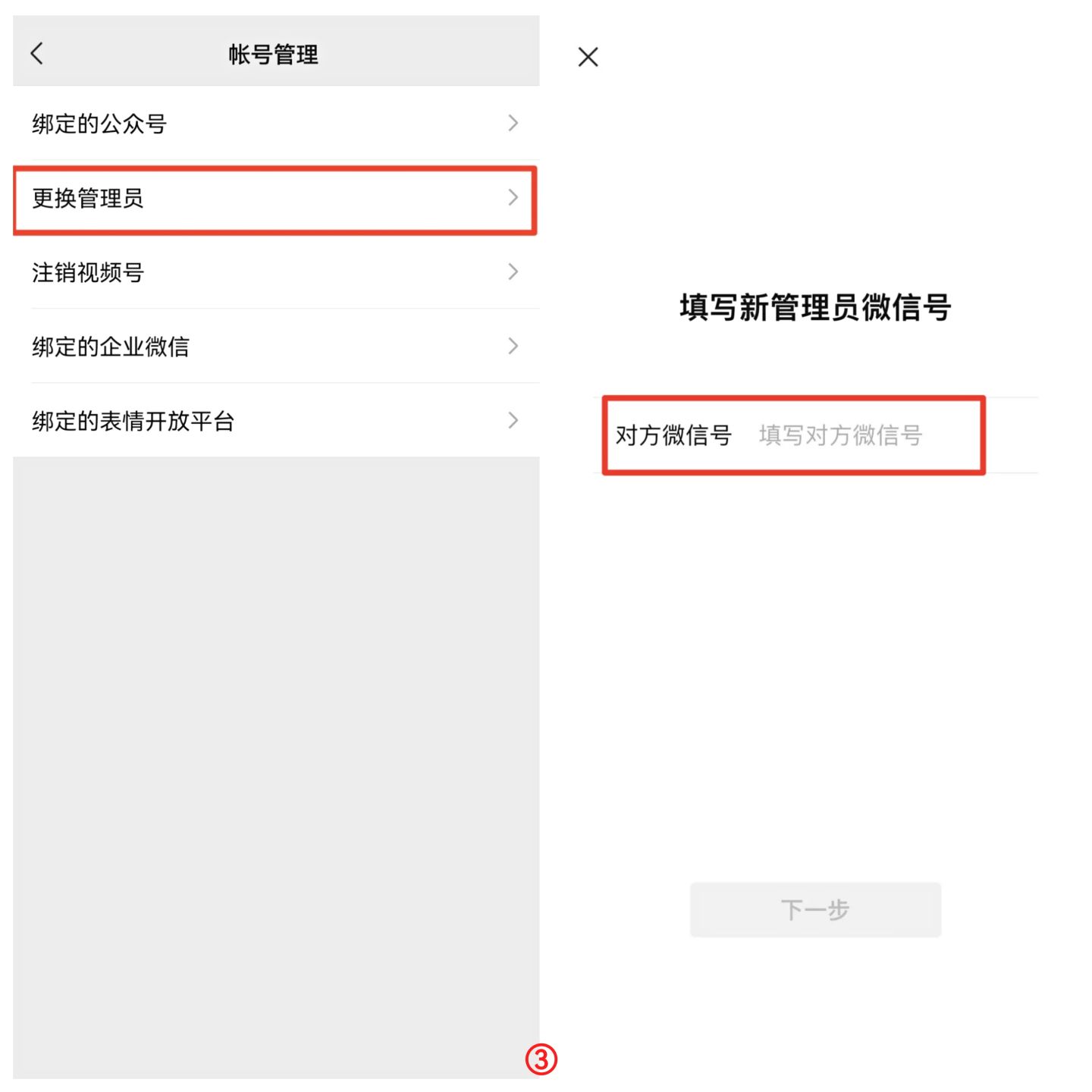 ③点击更换管理员,填写对方微信号。等待对方确认后即可完成管理员更换。
