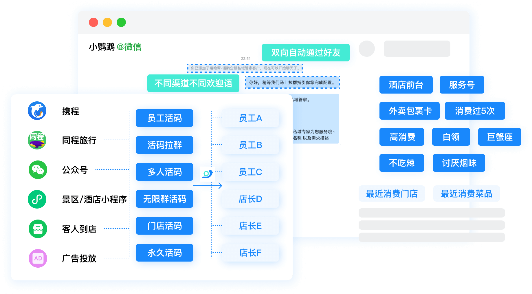 通过员工活码吸引酒店或旅游景区的访客扫码,实现即时通讯联系,提供服务信息、预订指引或特别优惠。 通过自动改备注和打标签的功能,酒店和旅游景区能够更有效地管理和跟踪客户信息,为后续的个性化服务和营销活动提供数据支持。 利用员工活码的自动拉群功能,酒店和旅游景区可以方便地将游客邀请进入宣传群,有效推广最新活动和优惠信息,增加销售机会。